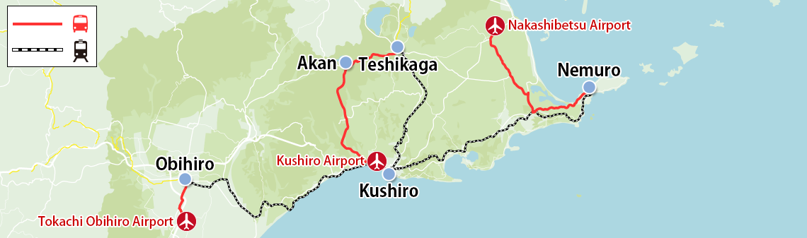 Daisetsuzan National ParkTaushubetsu River Bridge, Lake Nukabira, Lake Shikaribetsu, Mt. NipesotsuAkan-Mashu National ParkLake Akan, Lake Kussharo, Lake Mashu, Onneto, Ainu Kotan, Kawayu OnsenKushiroshitsugen National ParkKushiro Marsh Observatory, Onnenai Wooden Path, Hosooka Observatory, Lake Touro |
