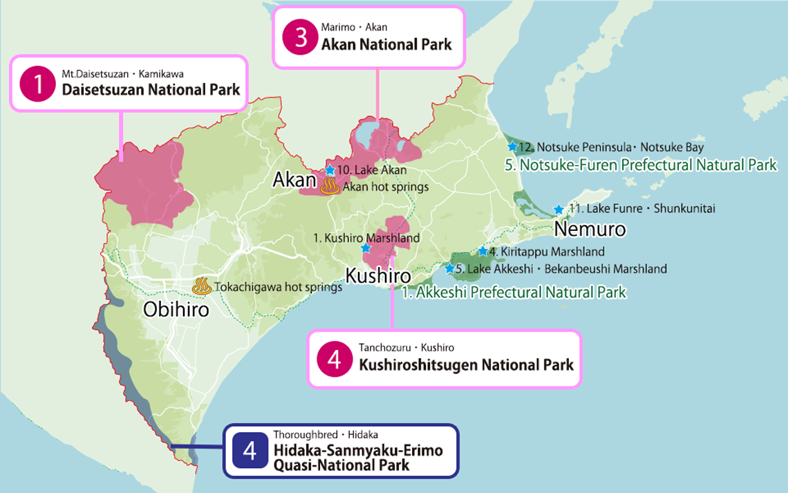 Hidaka-Sanmyaku-Erimo Quasi-National ParkNissho Pass Observatory, Satsunaigawa EnchiAkkeshi-Kiritappu-Konbumori Quasi-National ParkCape Shirepa, Lake Akkeshi, Bekkanbeushi Marshland, Kiritappu Marshland, Ayamegahara |