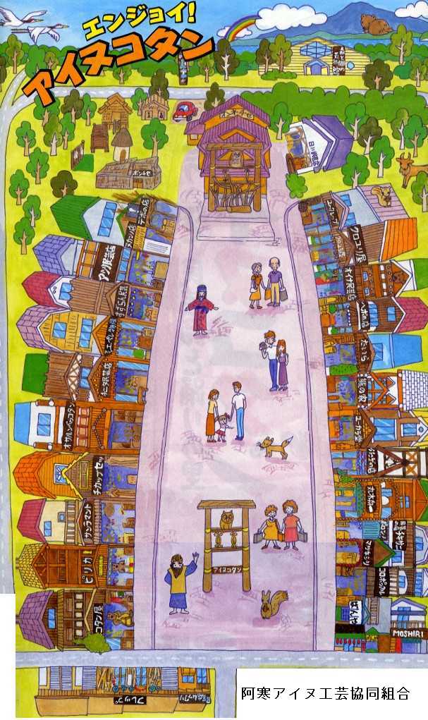 到了。阿伊努Kotan。没有面临着阿寒湖呢。集落出乎意料的干净、温暖而舒适。入口处有一座巨大的木雕拱门,是阿依努族的守护神猫头鹰的木雕。30来家礼品店和饮食店相对而建。中央有图腾柱,上面雕刻着的一个个形状都是神灵的象征(棕熊、鲸鱼、鹿、猫头鹰等),这些神灵都和住在阿寒的阿依努人的生活息息相关。