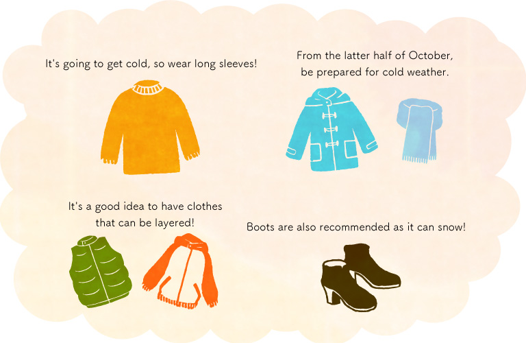 There will be a difference in temperature from region to region. In Sapporo, the average temperature is below 20 degrees Celsius and it feels cooler, but there is a lot of precipitation in September, so it is advisable to prepare rain gear. The first snow falls in late October and early November, and many households start using heaters, and Asahikawa and Furano sometimes get snow.